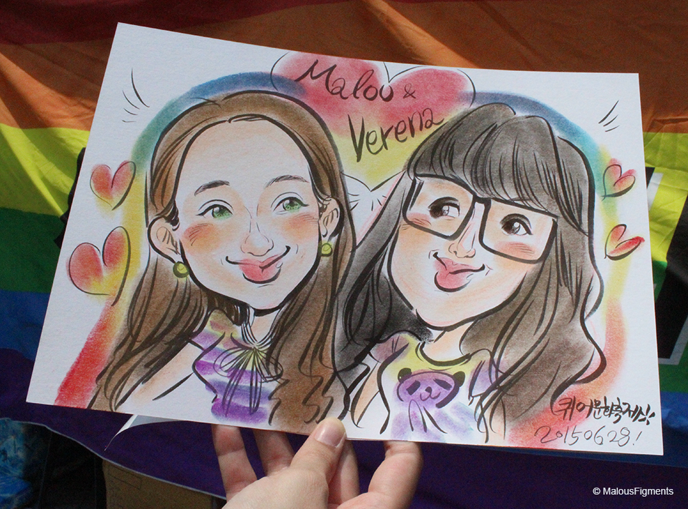 One booth sold on the spot drawn portraits of you and your friend or partner. Ina suggested we’d let her make one for us. The artist asked us whether we were friends to which we answered yes… but this is what came out of it: