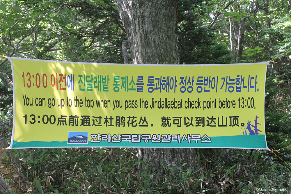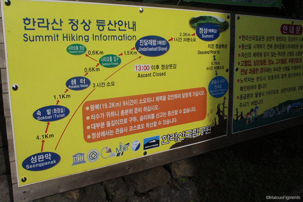 So first off, the Hallasan mountain is the highest mountain in South Korea (1950 meters). The area around the mountain is marked as a national park. There are 5 different hiking trails of which two lead to the summit of the mountain. We chose to do the Seongpanak trail of 9.6 kilometres long. This trail is marked as the easiest one and we later figured out that the Gwaneumsa trail of 8.7 kilometre was closed due to the danger of falling rocks. We didn’t have a good idea of what we were getting ourselves into. All we knew was that we wanted to reach the top.