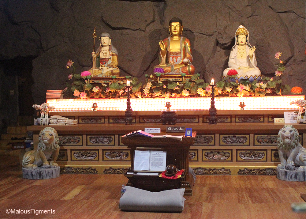 Located about 10 to 15 minutes away from the pond of God is the Yakcheonsa Buddhist Temple. Its name means carries the meaning of the temple where medicine water flows. Looking at its recent completion in 1990 you’d expect to find a modern looking temple. However, it was built after the style of the Buddhist temples of the early Joseon Dynasty and has the typical colours of traditional Korean houses. The Yakcheonsa temple is believed to be one of the largest in Korea. You can visit the Great Hall of Virochana Buddha, the Hall of the Three Sages, the Hall of 500 Arahan and the Cave Bharma Hall. Upon approaching the temple, Ina thought we might not be allowed inside but it is allowed as long you take off your shoes.